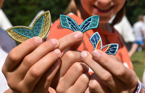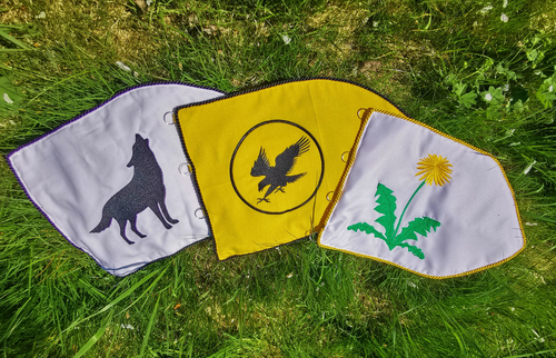 Oboustranně shodná družinová vlajka družiny Sedmikrásek. Šířka 42, výška 28 cm. Lemovaná šňůrkou a se dvěma oky pro přichycení k holi.